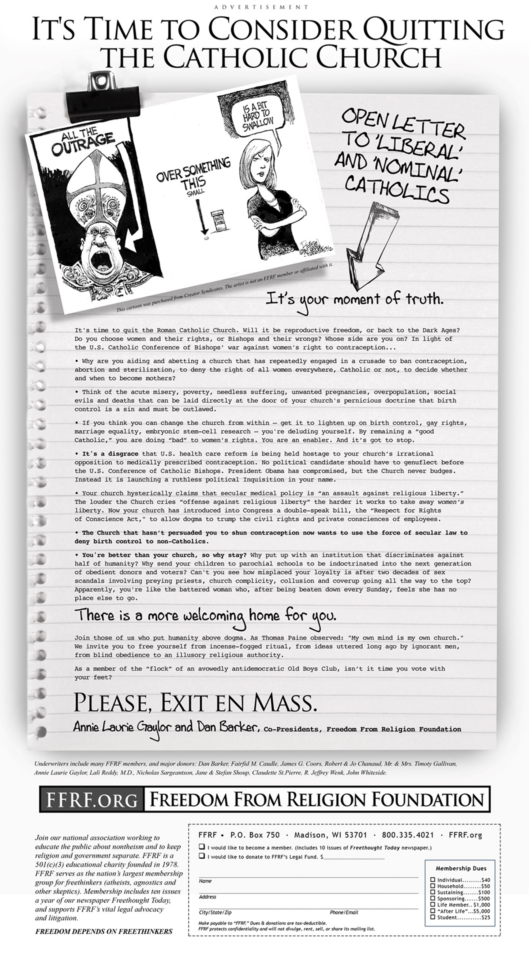 The Freedom From Religion Foundation placed an open letter via a full-page ad in today’s New York Times (page 10, front section) urging liberal and nominal Roman Catholics to “quit” their church over its war against contraception.
