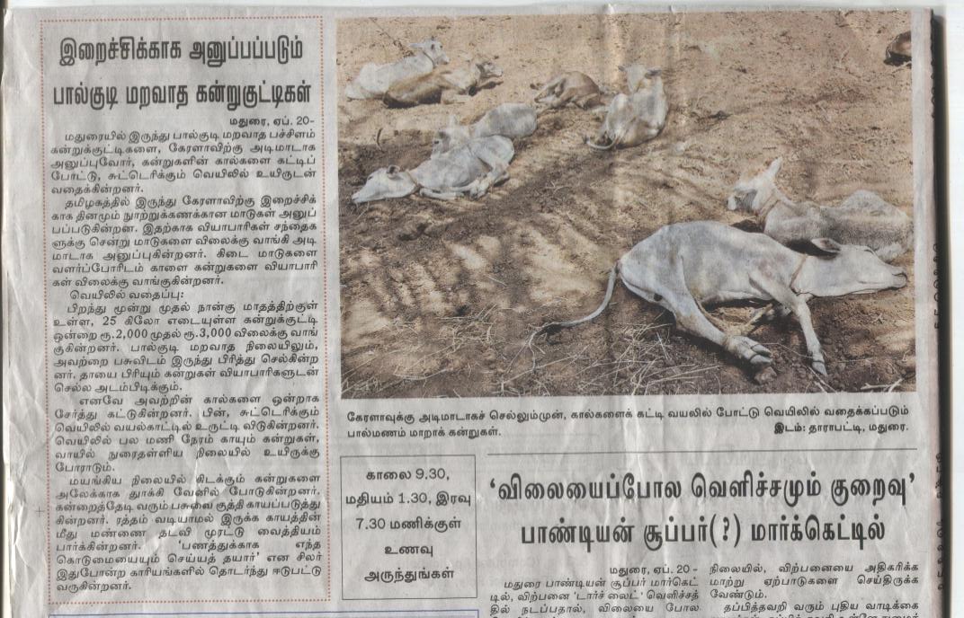 Madurai area: Suckling male calves tied and waiting for transport to Kerala for slaughter. They are left in the sun without water until the transport trucks arrive. This kind of inhumane treatment of animals would not be tolerated in Europe or the US, and the procuring agents and transporters would all go to jail. – Editor