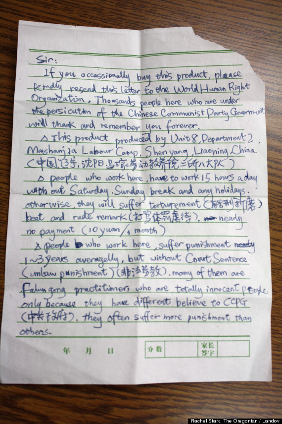 The letter reads: “Sir, if you occasionally buy this product, please kindly resend this letter to the World Human Right Organization. Thousands people here who are under the persecution of the Chinese Communist Party Government will thank and remember you forever.”