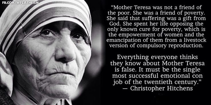 This returns us to the medieval corruption of the church, which sold indulgences to the rich while preaching hellfire and continence to the poor. MT was not a friend of the poor. She was a friend of poverty. She said that suffering was a gift from God. She spent her life opposing the only known cure for poverty, which is the empowerment of women and the emancipation of them from a livestock version of compulsory reproduction. And she was a friend to the worst of the rich, taking misappropriated money from the atrocious Duvalier family in Haiti (whose rule she praised in return) and from Charles Keating of the Lincoln Savings and Loan. Where did that money, and all the other donations, go? The primitive hospice in Calcutta was as run down when she died as it always had been—she preferred California clinics when she got sick herself—and her order always refused to publish any audit. But we have her own claim that she opened 500 convents in more than a hundred countries, all bearing the name of her own order. Excuse me, but this is modesty and humility?