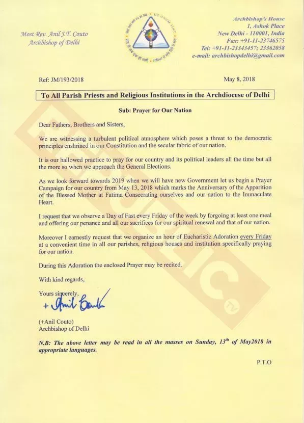 Delhi Archbishop Anil Couto’s letter to Catholics dated May 8, 2019 (see below), to “pray for democracy” and exhorting his flock to defeat Hindu forces is a battle cry that Prime Minister Narendra Modi and his party should take to heart very closely. Archbishop Couto is a representative of the most undemocratic organisation in the world and the agent of an alien nation state, the Vatican, which has imperial designs in its operational manifesto. The Christian call for battle bodes ill for India’s democracy and for its majority Hindus.