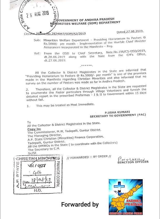 An order was issued on August 27 mentioning that providing honorarium to pastors was one of the promises made in the manifesto regarding Christian minorities. It also says that no survey on the number of pastors had been made so far in Andhra Pradesh.