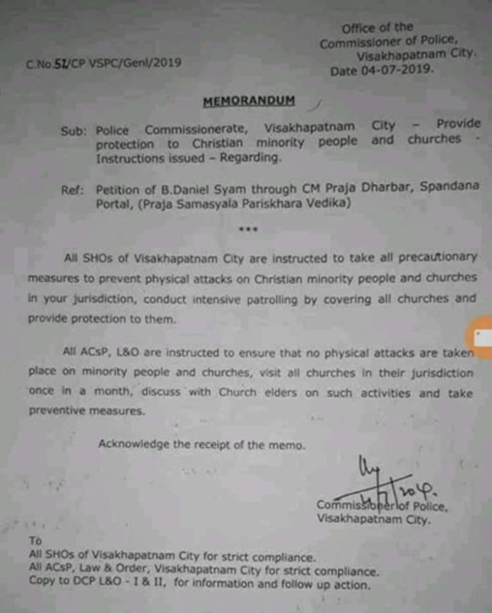 Andhra administration seems to be working hand in glove with Christian missionaries. Visakhapatnam’s police commissioner Rajiv Kumar Meena issued a memorandum to the city police to protect minority Christians and their churches from Hindu aggression. As per Vizag’s city police website, the commissioner took charge on 27th June 2019 and this memorandum was issued on 4th July 2019. Commissioner did not waste any time issuing the orders to protect the Christians. The person who requested protection seems to have close links with the Andhra Christian chief minister Y.S. Jaganmohan Reddy.