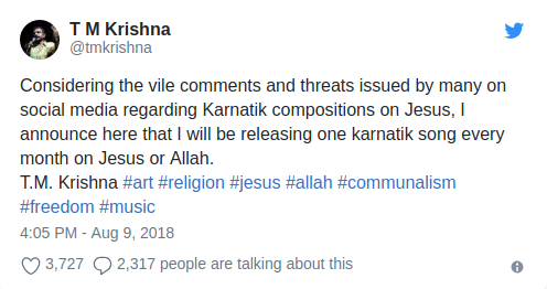 Recently, there was a hullabaloo over the participation of O. S. Arun in a Christian Carnatic concert and the subsequent focus on an album of Christian Carnatic songs. Various Carnatic artists, both famous and not so famous, came out in support of the album and labelled those who raised concerns communal and narrow-minded. One famous artist tweeted that he pledges to release one Carnatic song on Jesus or Allah every month just to spite the people who are finding an issue with this.