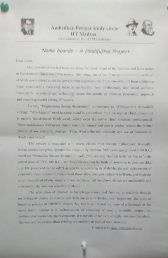 The Ambedkar Periyar Study Circle (APSC) has been de-recognised for the simple reason that they did not follow standard procedures common for all such institute bodies while conducting their activities. We, a few students of IITM, are saddened by the fact that a straightforward debate based on facts has not occurred on this issue. – Some IITM Students