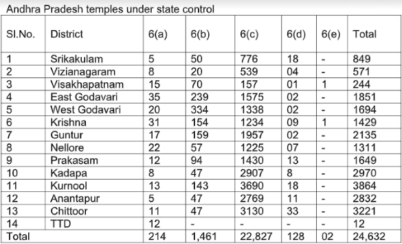 A total of 24,632 Hindu temples and religious institutions (see details in table below) have been taken over by the government under section 6 of the Andhra Pradesh Charitable and Hindu Religious Institutions and Endowments Act, 1987, including 12 temples of the Tirumala Tirupati Devasthanams (TTD) as per section 95 read with 6 of the said Act. Temples and religious institutions are classified as per clauses of section 6 in the following way: