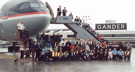 All of a sudden the curtains parted and I was told to go to the cockpit, immediately, to see the captain. As soon as I got there I noticed that the crew had that “All Business” look on their faces. The captain handed me a printed message. It was from Delta’s main office in Atlanta and simply read, “All airways over the Continental United States are closed to commercial air traffic. Land ASAP at the nearest airport. Advise your destination.” No one said a word about what this could mean. We knew it was a serious situation and we needed to find terra firma quickly. The captain determined that the nearest airport was 400 miles behind us in Gander, New Foundland. He requested approval for a route change from the Canadian traffic controller and approval was granted immediately—no questions asked. We found out later, of course, why there was no hesitation in approving our request. While the flight crew prepared the airplane for landing, another message arrived from Atlanta telling us about some terrorist activity in the New York area. A few minutes later word came in about the hijackings. We decided to LIE to the passengers while we were still in the air. We told them the plane had a simple instrument problem and that we needed to land at the nearest airport in Gander, Newfoundland, to have it checked out. We promised to give more information after landing in Gander. There was much grumbling among the passengers, but that’s nothing new! Forty minutes later, we landed in Gander. Local time at Gander was 12:30 PM, that’s 11:00 AM EST.There were already about 20 other airplanes on the ground from all over the world that had taken this detour on their way to the US.