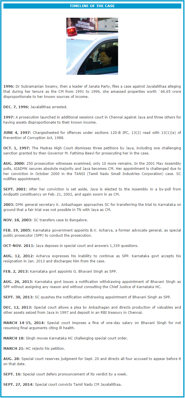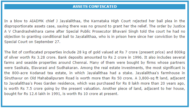 It all started with Dr. Subramanian Swamy files a complaint against Jayalalithaa on June 14, 1996. The then DMK government directed the DVAC to register FIR against her for possession of unaccounted wealth. Charge sheet was also filed against her and the three others. As most of the witnesses turned hostile after her coming back to power in 2001, DMK’s Anbazhagan and Dr. Swamy moved to the Supreme Court on February 2003 for transfer of trial from Tamil Nadu and the SC transferred it to Karnataka. A Special Court was set up in December 2003 and trials proceeded. As the trials were going on in Bangalore, she could not use her influence despite coming back to power in 2011. In between her every attempt to approach the Supreme Court for interim relief was rejected by the SC which sent her and her associates back to Karnataka Special court. Ultimately, she had to appear twice in person to answer more than a thousand questions posed by the Special Court. Trial concluded on August 28, 2014 and finally the conviction orders were pronounced on September 27. Her appeal and bail application was refused by the Karnataka High Court on October 7. Justice A.V. Chandrashekhara, in his order pronounced in a packed court room that there “are no grounds” to give bail to the former Tamil Nadu Chief Minister and observed that corruption amounts to “violation of human rights” and leads to economic imbalance.