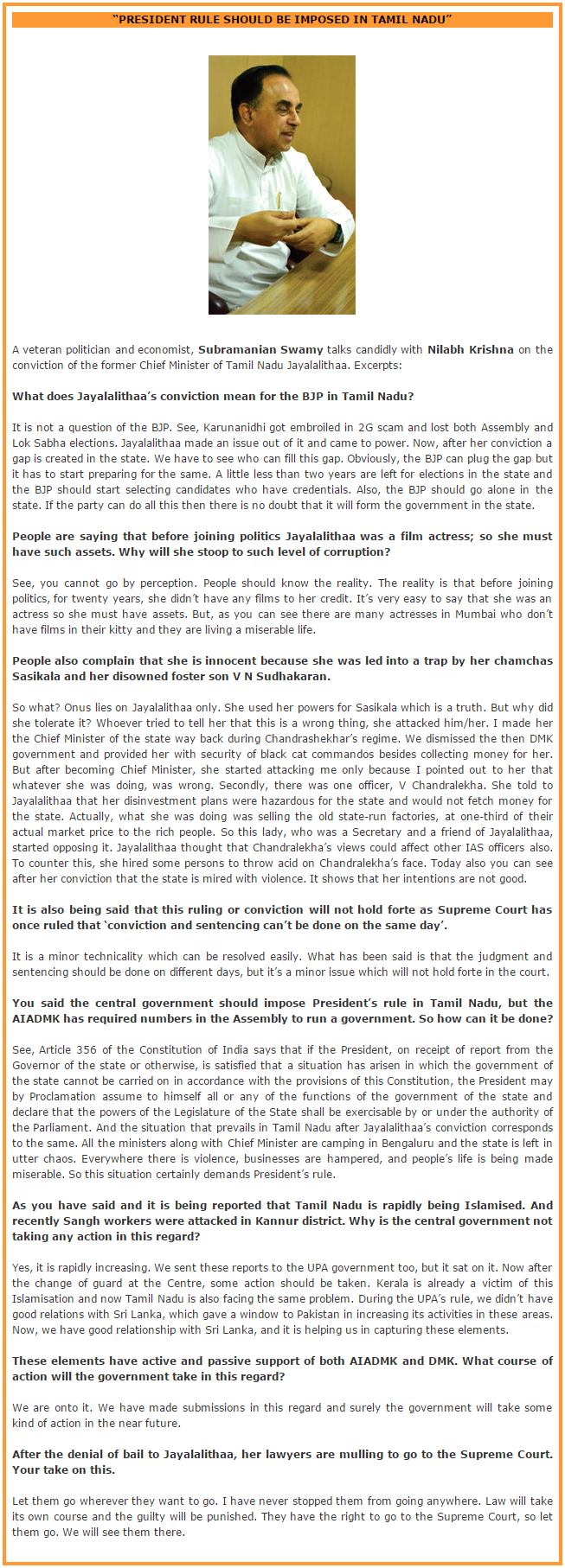 The present scenario has opened up a great opportunity for the BJP: increasing membership, creating Hindu vote bank, politics of corruption and crime being practised by the Dravidian parties for more than five decades, mismanagement of temples, cow slaughter and cattle trafficking, growth of evangelism, rise in Islamic fundamentalism, assaults and murders of Hindu leaders and activists, etc., are some of the major avenues through which the party can reach out to the masses. It can also take the central government’s development oriented policies to create an impression in the minds of the people. The Sri Lankan Tamils issue and the fishermen issue could be properly addressed to win the hearts of Tamils. The centre could use its diplomatic skills fully to address both the issues and considerable improvement in them would pay excellent dividends in the state. The party can utilise Subramanian Swamy’s crusade against corruption to the hilt by pursuing the scams perpetrated by both the DMK and the Congress. The party may not shy away from attacking Jayalalithaa and AIADMK irrespective of her getting bail or not. The present setback for Jayalalithaa may be fully utilised by the party.