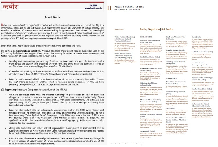 Kejriwal branched off from Parivartan to establish yet another NGO, Kabir. As per the documents, Kabir was established on 15 August 2005. This was again illegal, as Kejriwal continued to be in government service. The subversive agenda of the Ford Foundation is quite clear in the contradictions in dates between financial documents declared by Kabir and Ford Foundation. While Kabir claims that the NGO began its operations on 15 August 2005 in which the contribution from Ford Foundation was Rs43,48,036/-, whereas the annual report of Ford Foundation claims to have made a contribution to Kabir to the tune of $172,000 on 15 July 2005. It is not only intriguing that the Ford Foundation funding to Kabir began from the very first year of its operation, but the money was given one month before its birth. The fraud is evident from the two sets of documents of Kabir and Ford Foundation, given below.
