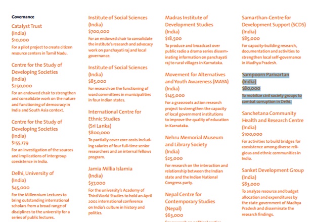 The grants given by Ford Foundation in 2002 to various Indian entities are given below in the accessed document. Arvind Kejriwal’s NGO Sampoorna Parivartan [aka Parivartan] and CSDS (Center for the Study of Developing Societies) have been granted $80,000 and the $250,000 respectively. Key associates of Arvind Kejriwal like Yogendra Yadav have been functionaries of the CSDS. What makes this funding to Kejriwal a criminal activity is the fact that he in 2002 was still a government servant and therefore not entitled to receive it. Government servants are not permitted to float NGOs without due permission.