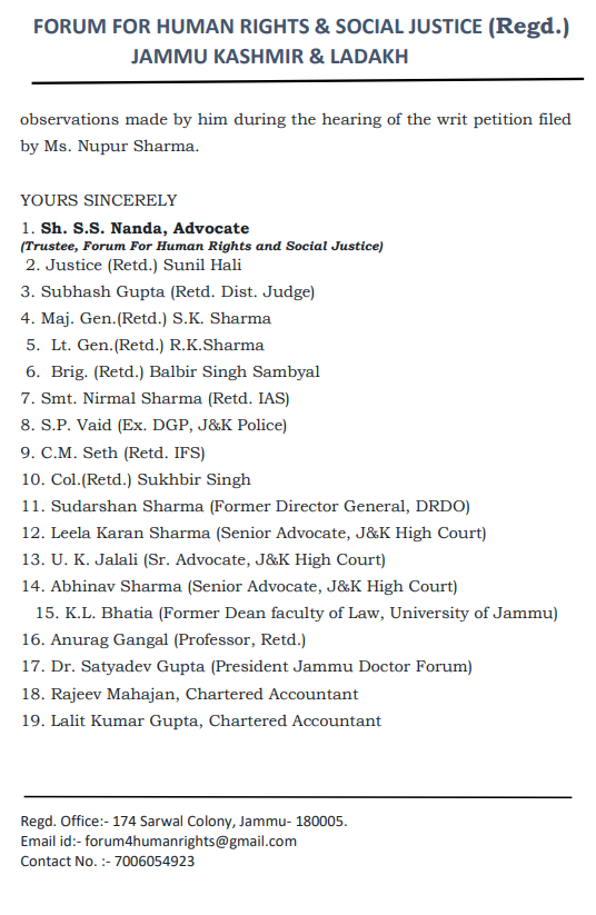 An open letter (see below) signed by 15 retired judges, 77 retired bureaucrats and 25 retired armed forces officers, against the observation made by Justices Surya Kant and JB Pardiwala while hearing Nupur Sharma’s case in the Supreme Court.