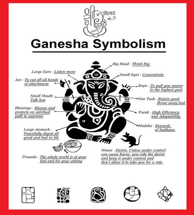 Legends are many as to how Ganesha got this anthropomorphic form. But wise youth will ponder over the symbolic representation of the Ganesha tattva. Ganesha stands for clarity of mind. For the clarity of the mind, a large head which can conceive and understand the Vedic truths is required. And the ears should be wide enough to hear clearly the srutis. The long trunk stands for the power of discrimination which can solve gross problems in the outer world, which are similar to lifting of heavy weight, and also be employed in the subtle realms of inner personality layers, which can be compared to plucking small blades of grass. His pot-belly stands for the capacity of the mind to digest all sorts of experiences—pleasant or unpleasant. Thus every aspect of his form is a symbolic representation of an aspect of the perfected mind, the pranava swaroopa. Similarly every action attributed to Lord Ganesha also represents some subtle truth. His riding the mouse points out that a perfected mind can ride over and control desires which run towards sense objects. His circumambulatiing the ओ३म्Divine Parents and thus defeating his brother in a race round the world signifies that all knowledge is encompassed by the realization of the Supreme Wisdom.