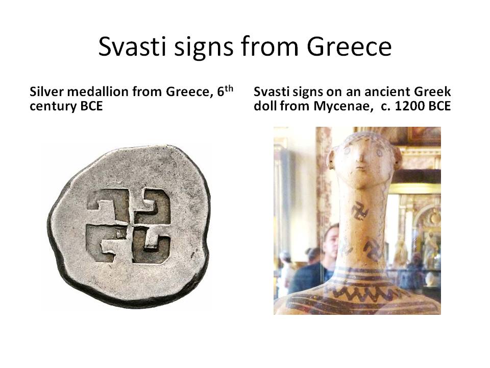 Until its misuse by the Nazis, the svasti signs were used everywhere with its real meaning as an auspicious sign or harbinger of well-being. Its appearance in Europe goes back perhaps 3000 years if not earlier. It seems to have been particularly popular in the Greco-Roman world as may be seen in the examples given. Svasti signs can be found in the New World also on numerous Native American artifacts as auspicious symbols.